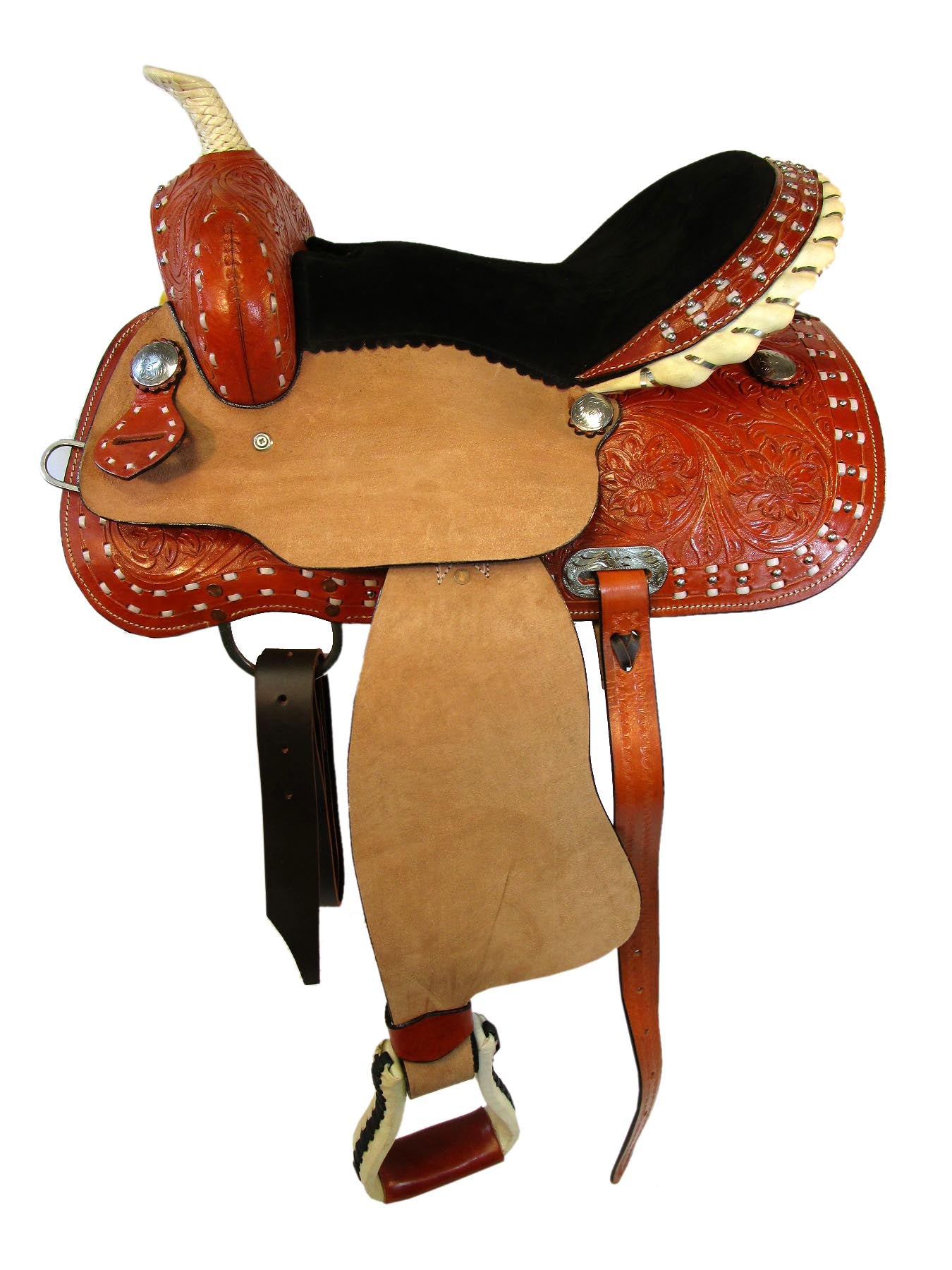 ¡El sillín occidental de carreras con barril con tachuelas plateadas con puntadas florales es un atractivo para la tendencia y el estilo de una auténtica vaquera y vaquero! ¡El cuero genuino y duradero con un llamativo diseño floral trabajado a mano proporciona una apariencia profesional que mantendrá este sillín luciendo genial en los años venideros! El sillín tiene doble costura Buck y tachuelas plateadas. Características adicionales Rough Out Jockey & Fender para un excelente agarre mientras giras los barriles... El concho plateado hace que este sillín sea más efectivo y excelente para desfiles de moda. Refuerzo de nailon en estribo de cuero para mayor seguridad.