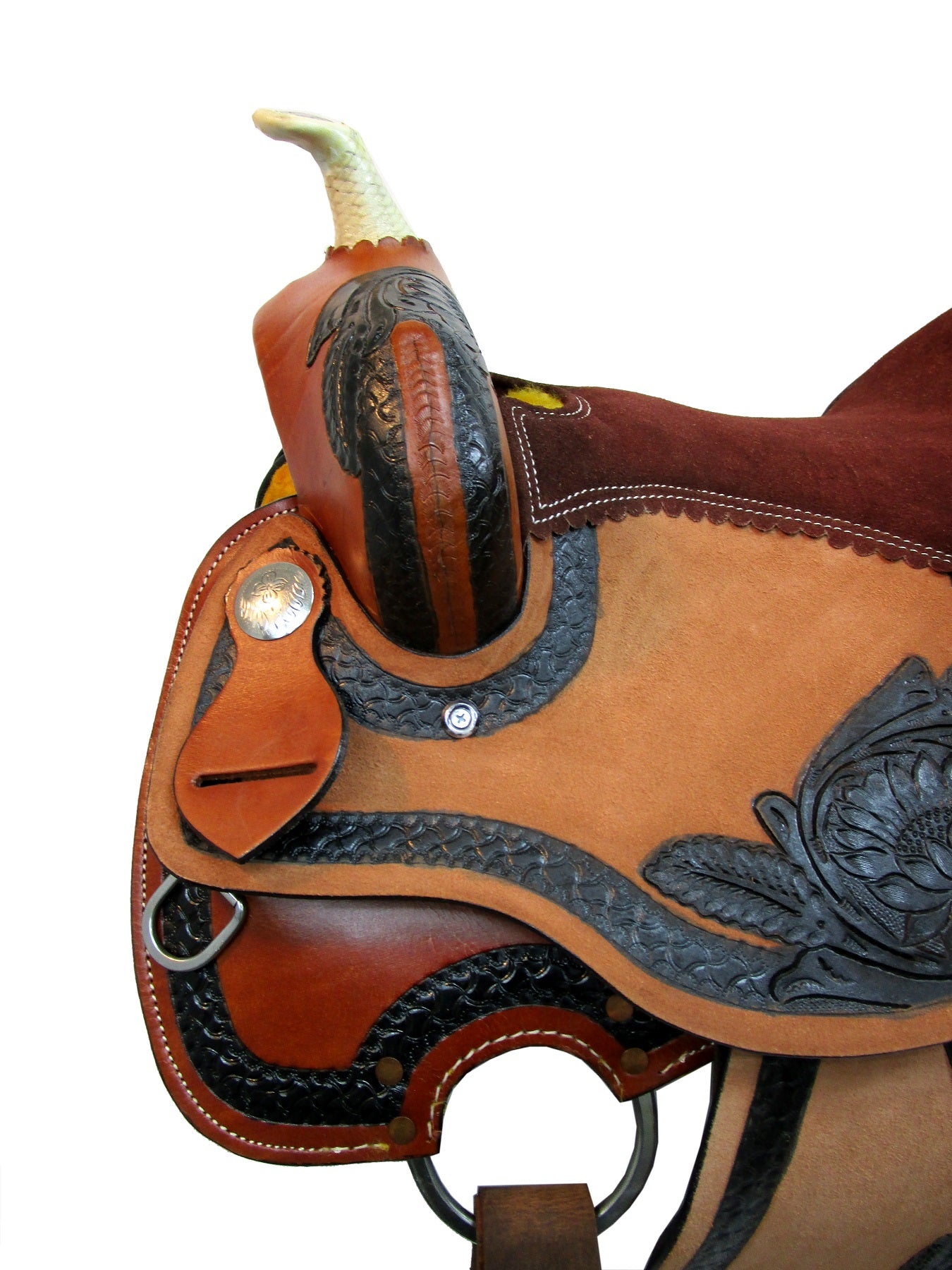Ride in classic Western style with this antique-finish hand-tooled leather saddle, perfect for trail and pleasure riding. The rough-out jockey and fenders provide secure traction, while the padded brown suede seat ensures comfort during long hours on the trail. Crafted on a lightweight wood-and-fiberglass tree, this saddle offers strength, balance, and easy handling. Nylon-reinforced stirrups enhance safety and long-term durability, making it a reliable companion for everyday riding.