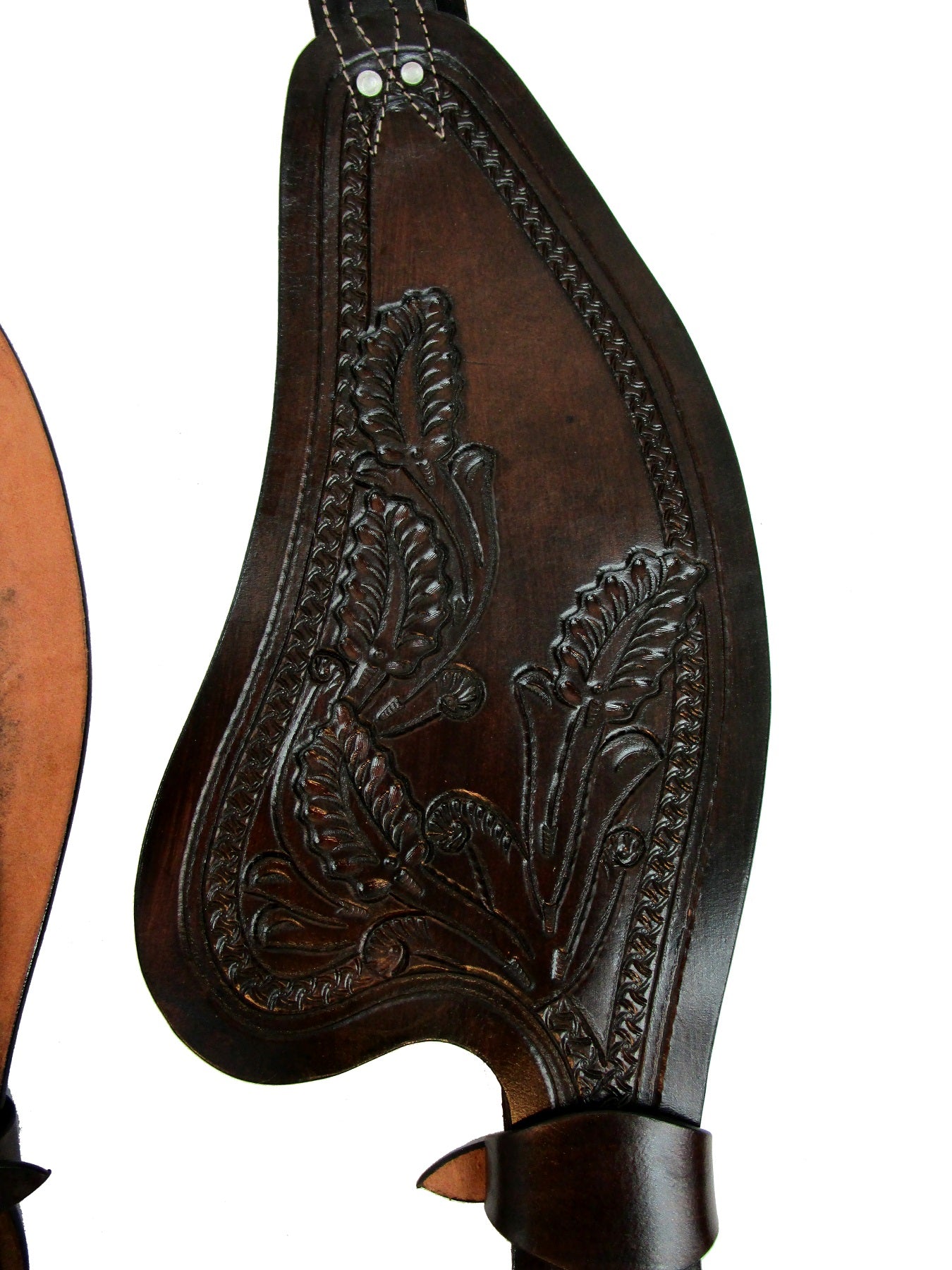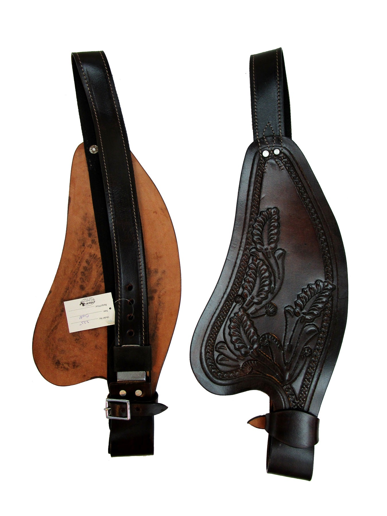 Dark brown floral tooled leather saddle's fender is right choice to replace your old fenders and give your saddle a new look. Features oak floral tooled . Extra durability we added nylon enforcement. Smooth leather nice finish. Easy to replace. This saddle can fit to any western saddle .