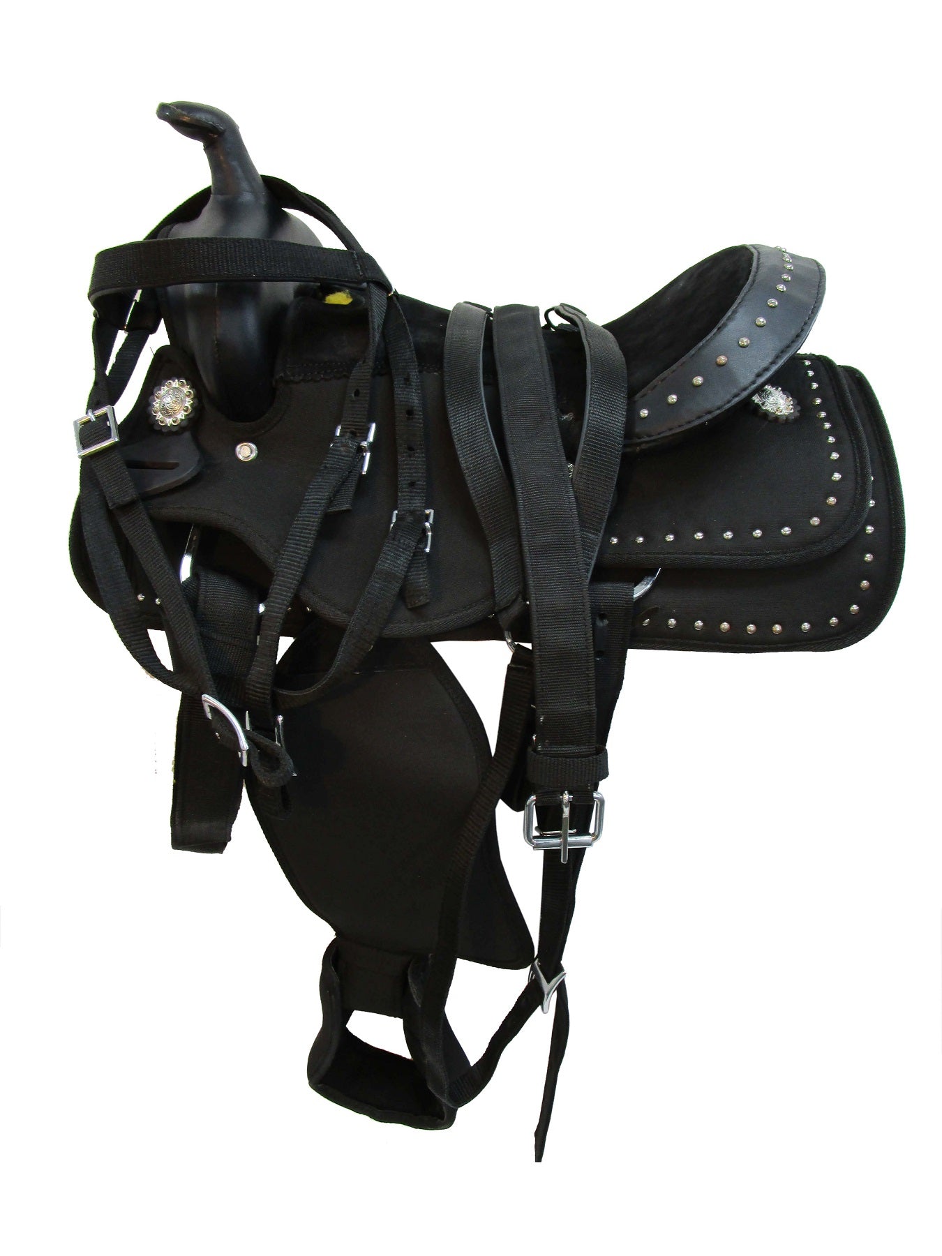 Give your young rider the perfect start with this kids Western saddle set, designed for safety, comfort, and long-lasting use. Built with a sturdy Semi Quarter Horse Bar tree, it features a soft black suede padded seat, silver-studded skirt corners, and reinforced nylon binding for added tear resistance. The underside is lined with soft synthetic fleece for your horse’s comfort, making this saddle ideal for trail rides, training, and rodeo fun.