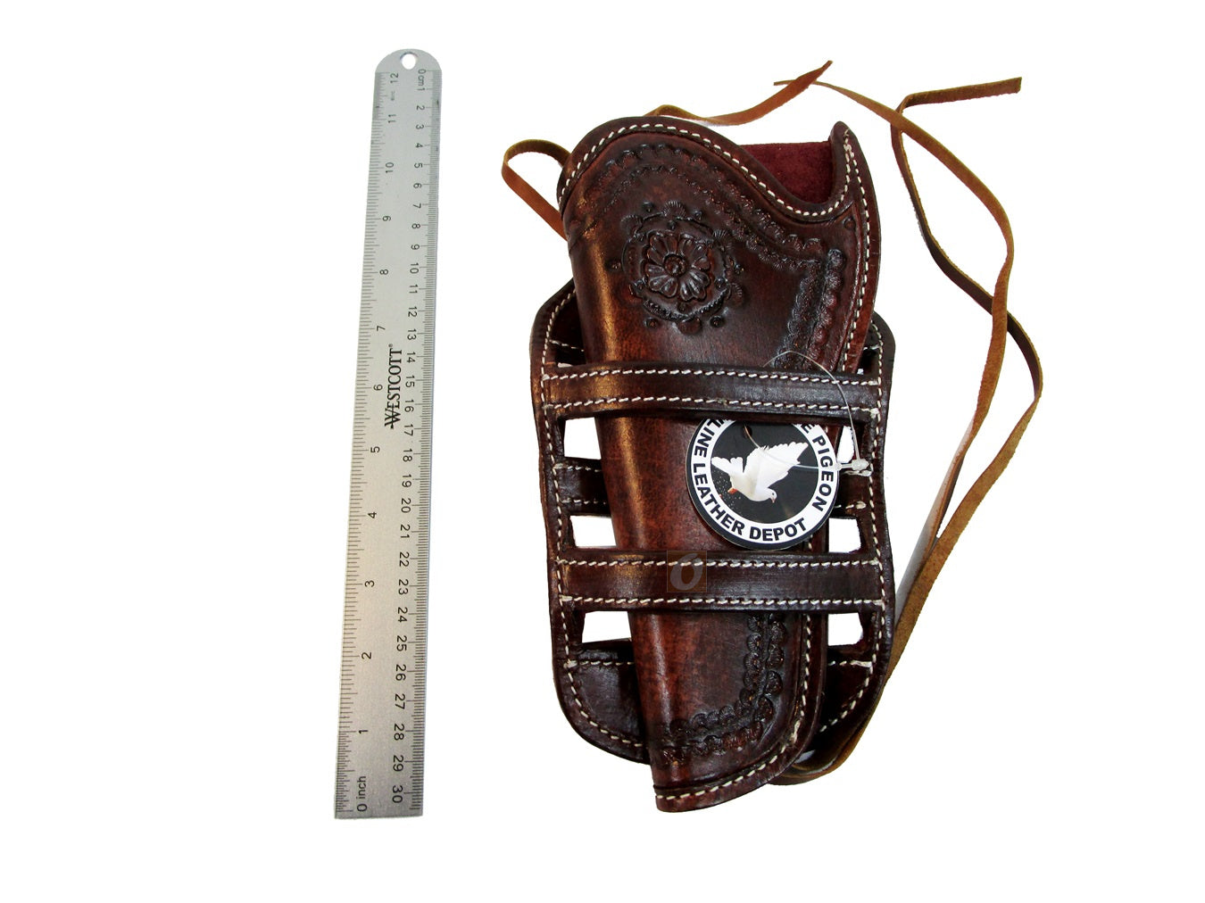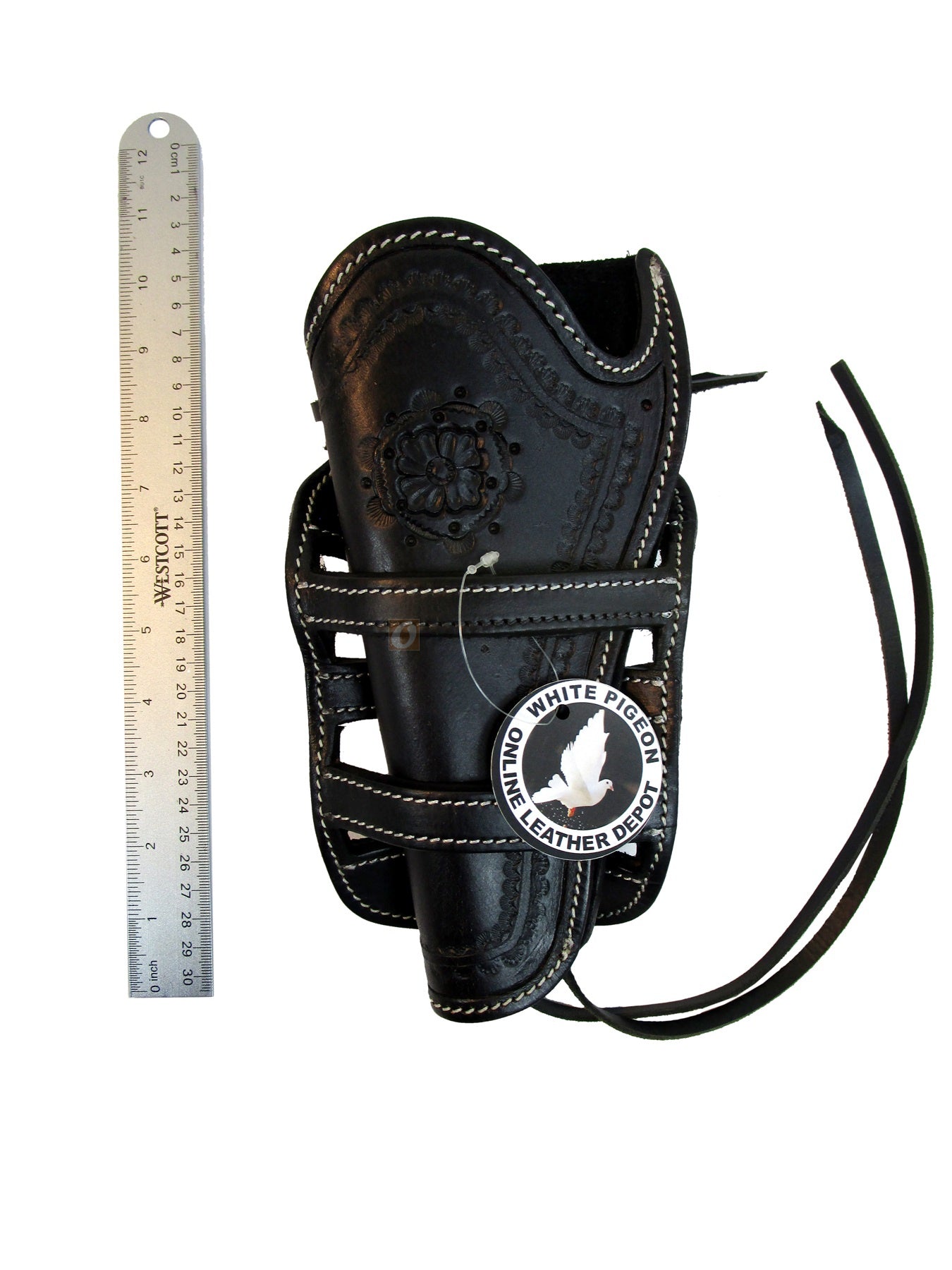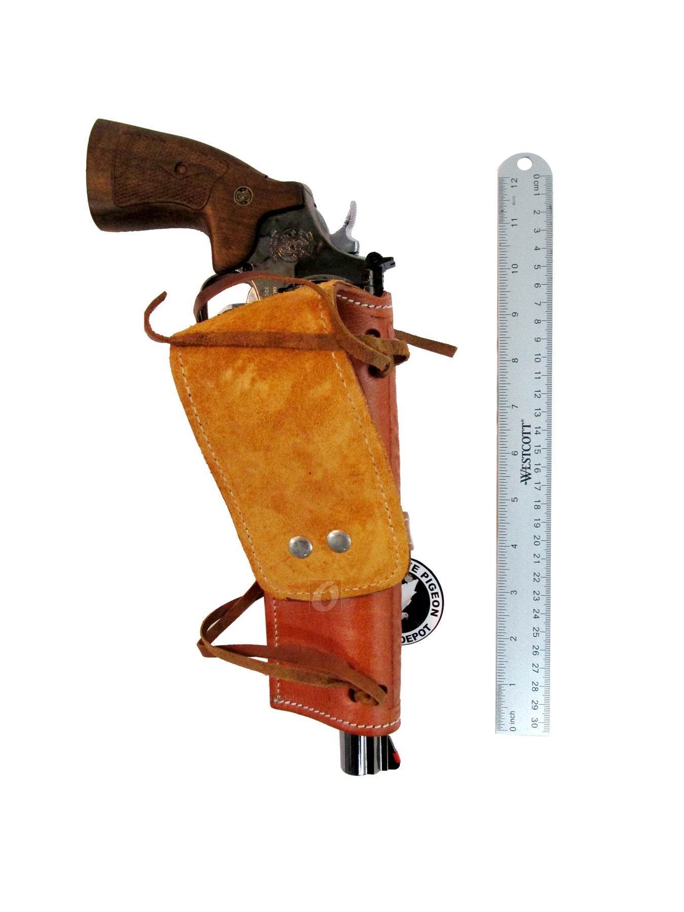 The holster measures 9 inches in length with an open-bottom design—ideal for accommodating longer barrels while maintaining easy draw and reholstering. Made from durable, thick leather, it molds naturally to your revolver for a firm, secure hold and a classic Western look that stands the test of time.