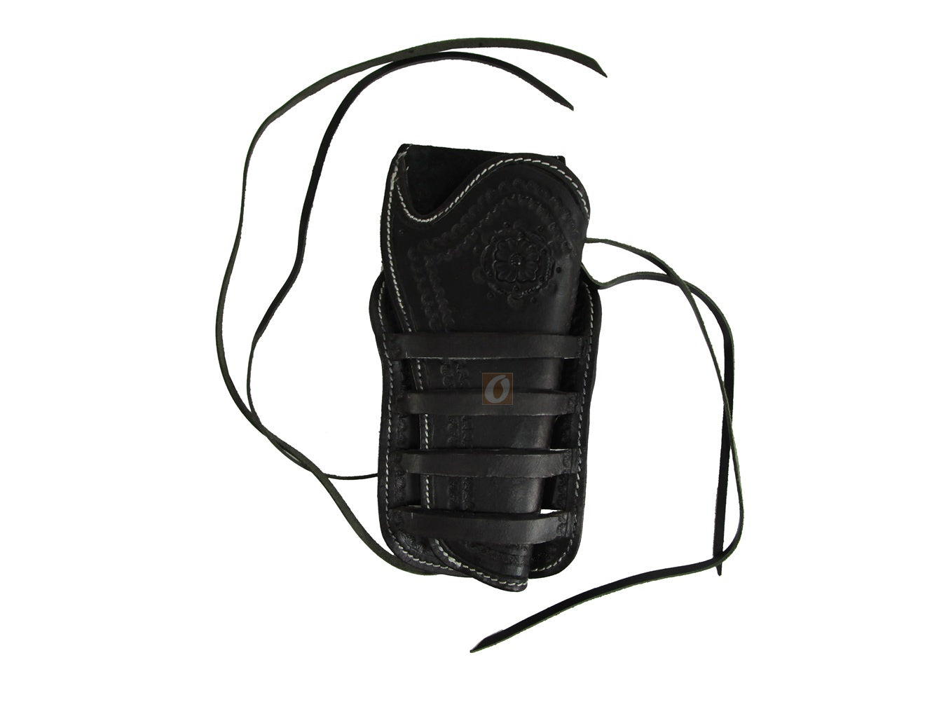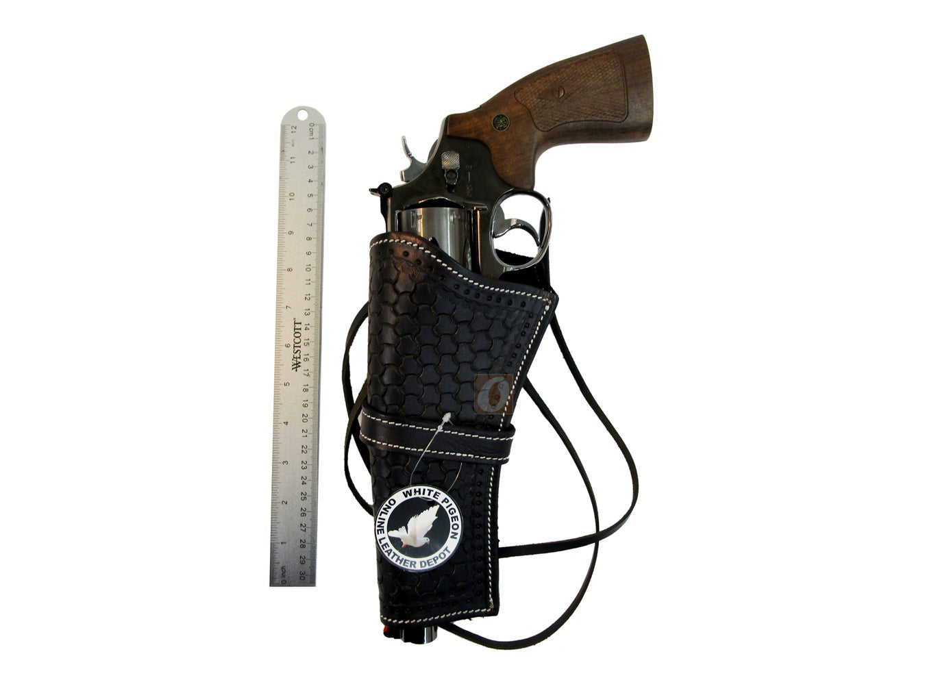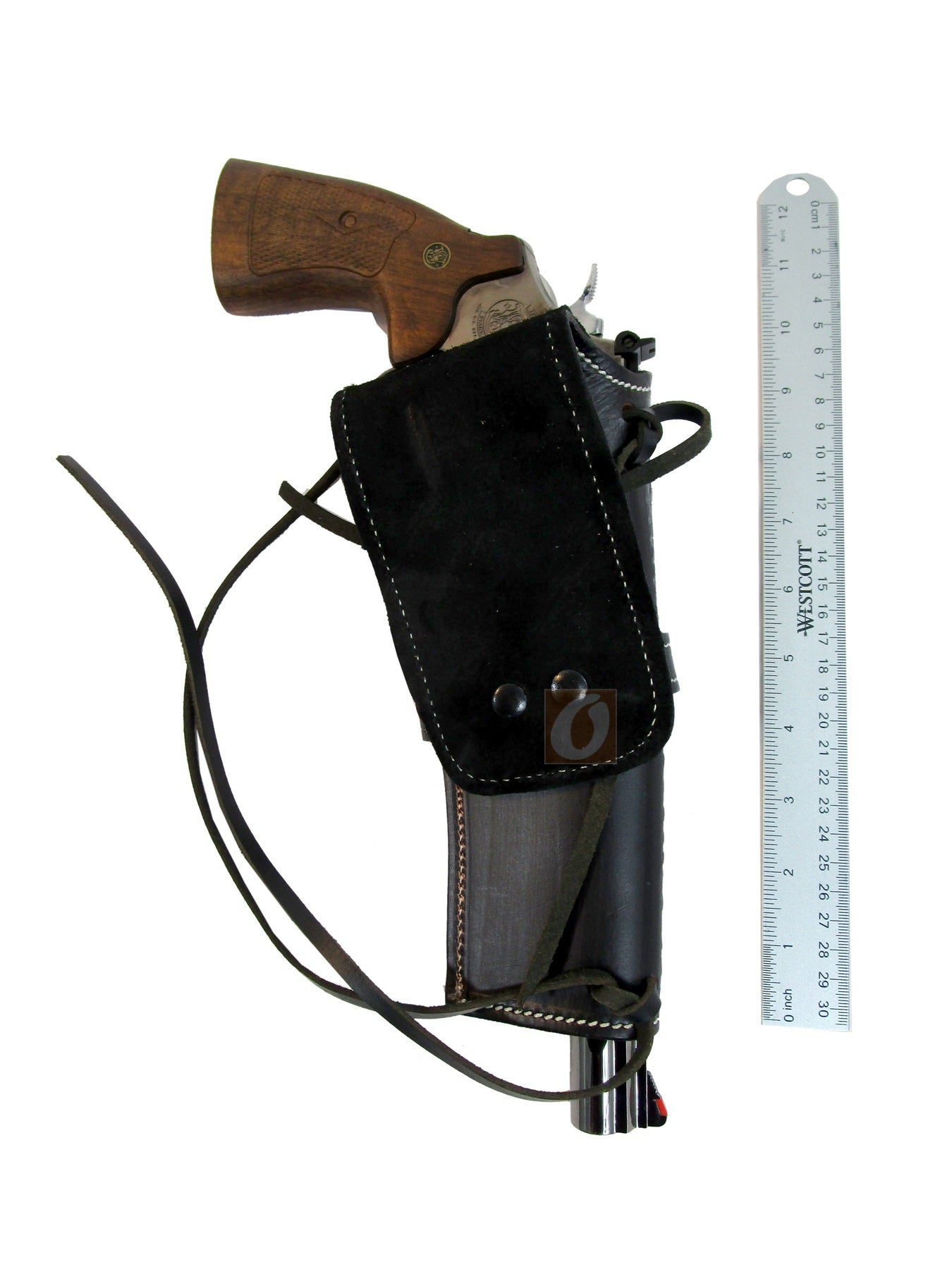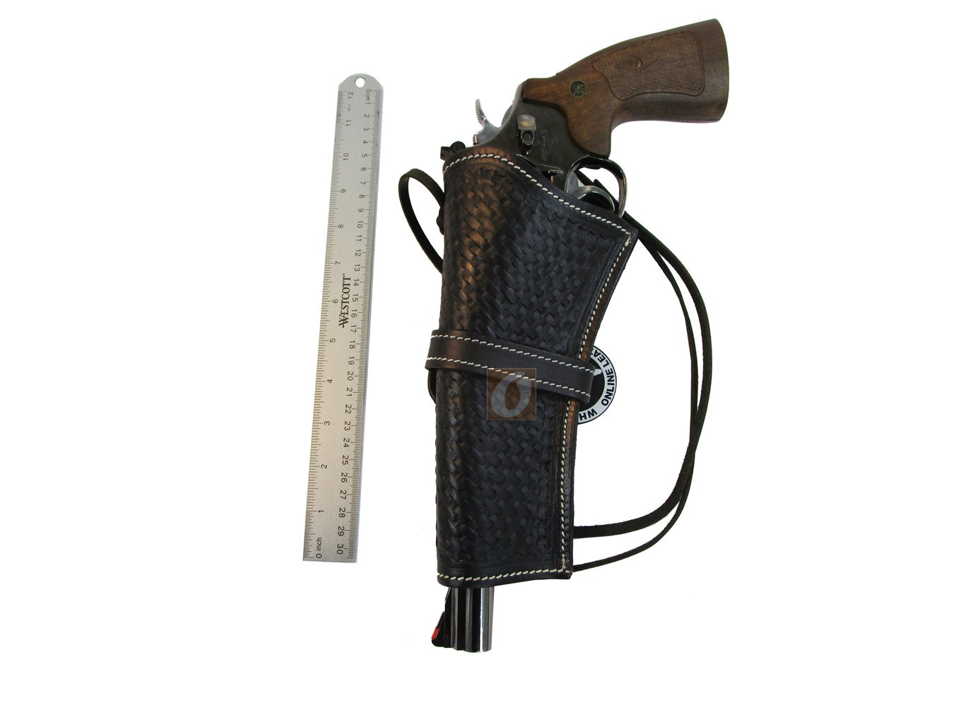 The holster measures 9 inches in length with an open-bottom design—ideal for accommodating longer barrels while maintaining easy draw and reholstering. Made from durable, thick leather, it molds naturally to your revolver for a firm, secure hold and a classic Western look that stands the test of time.