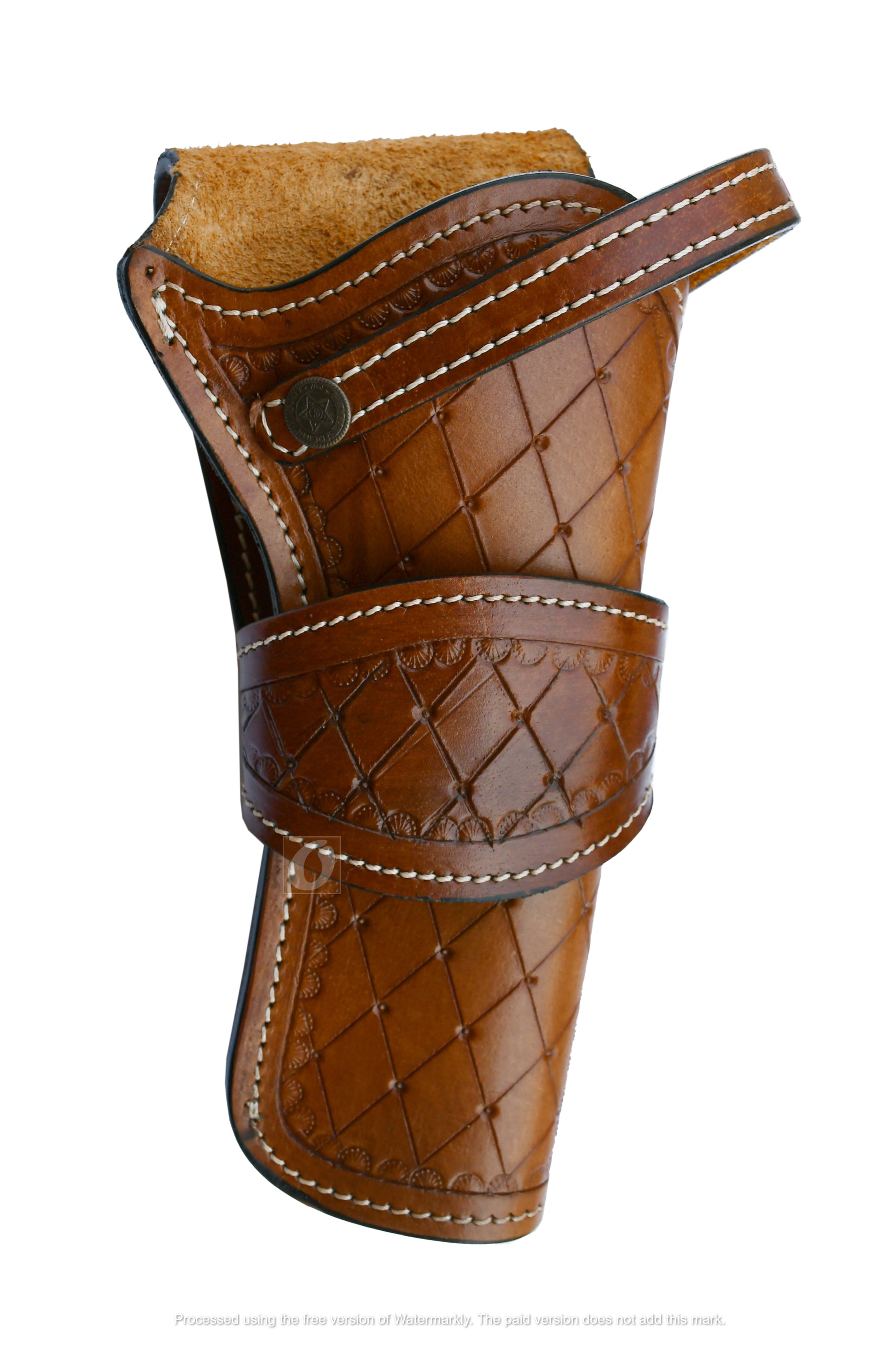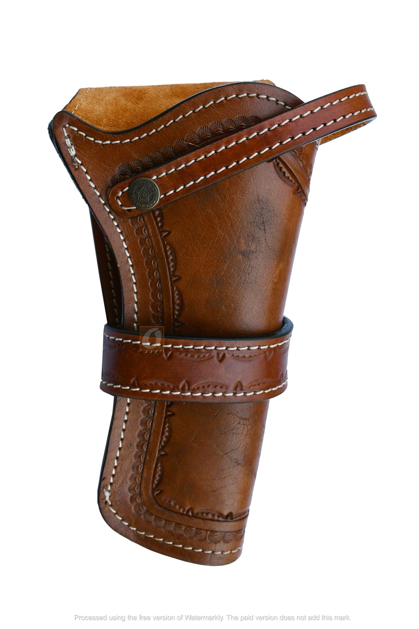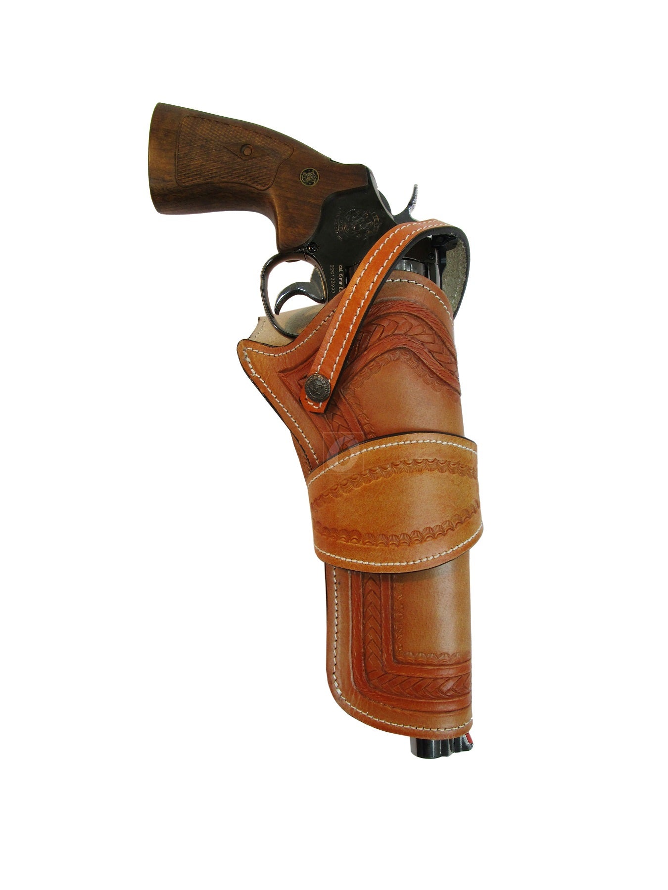 Handmade genuine leather revolver holster fits 5" and longer barrels, including 7"+. Works with .22, .32, .38, 357 Mag, .44, and .45 calibers. Perfect fit for popular revolvers like Ruger Wrangler, Ruger Single Six, Taurus, Smith & Wesson, Heritage Rough Rider, and Cimarron Pistolero. Hand-tooled with smooth, hand-rubbed edges for lasting comfort and durability.