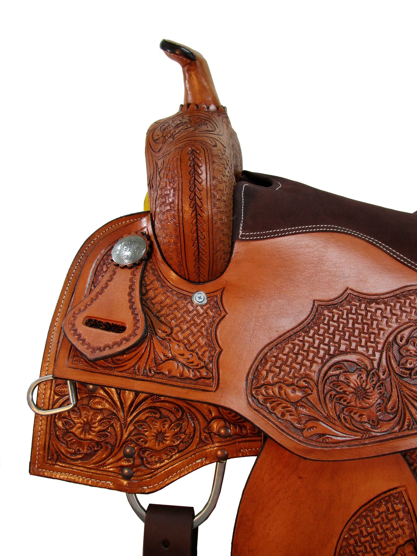 Beautiful floral tooled Western saddle that stands out on pleasure and trail rides. Finished in rich brown for a bold look with a well-padded brown suede seat for all-day comfort. Double-stitched skirts. Solid fiberglass tree is sturdy, lightweight, and built for strength. Nylon reinforcement on fenders and billet straps adds durability.