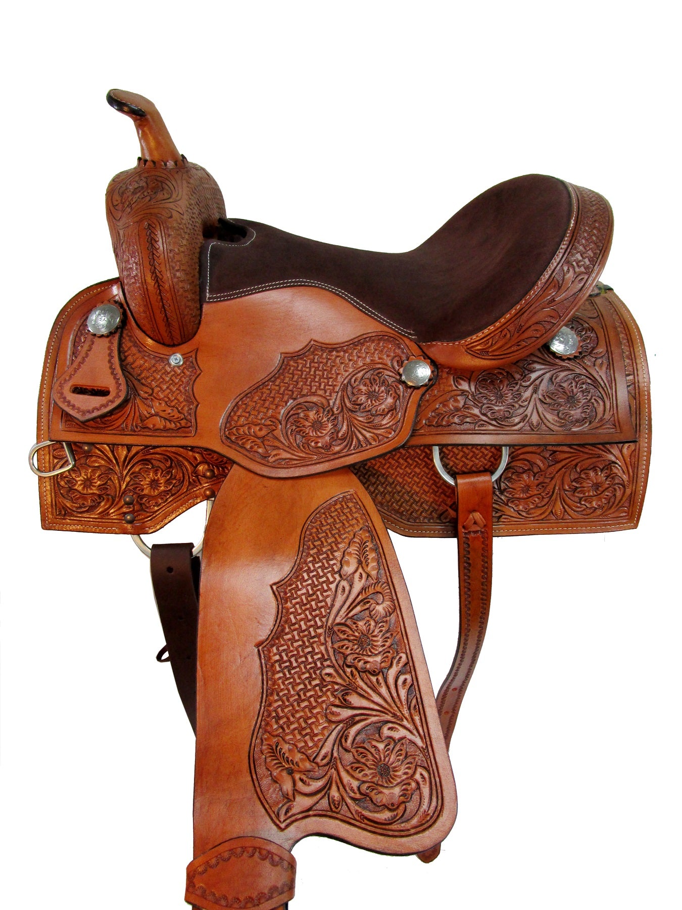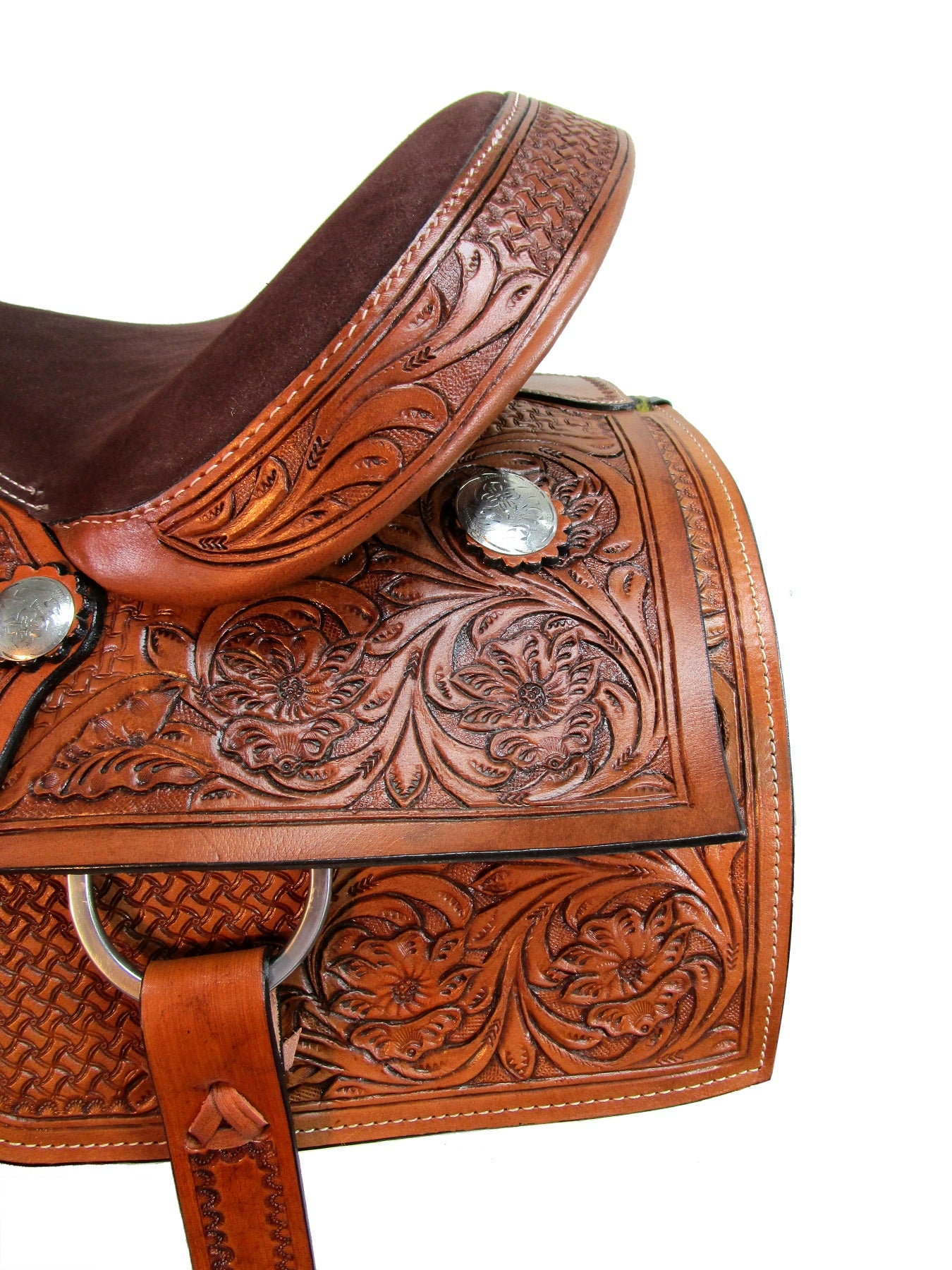 Floral Tooled Western Pleasure Trail Saddle, Brown Suede Seat, Semi QH Bars