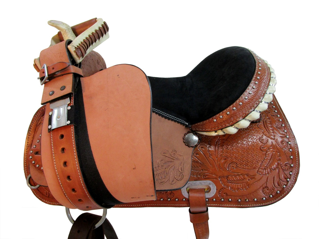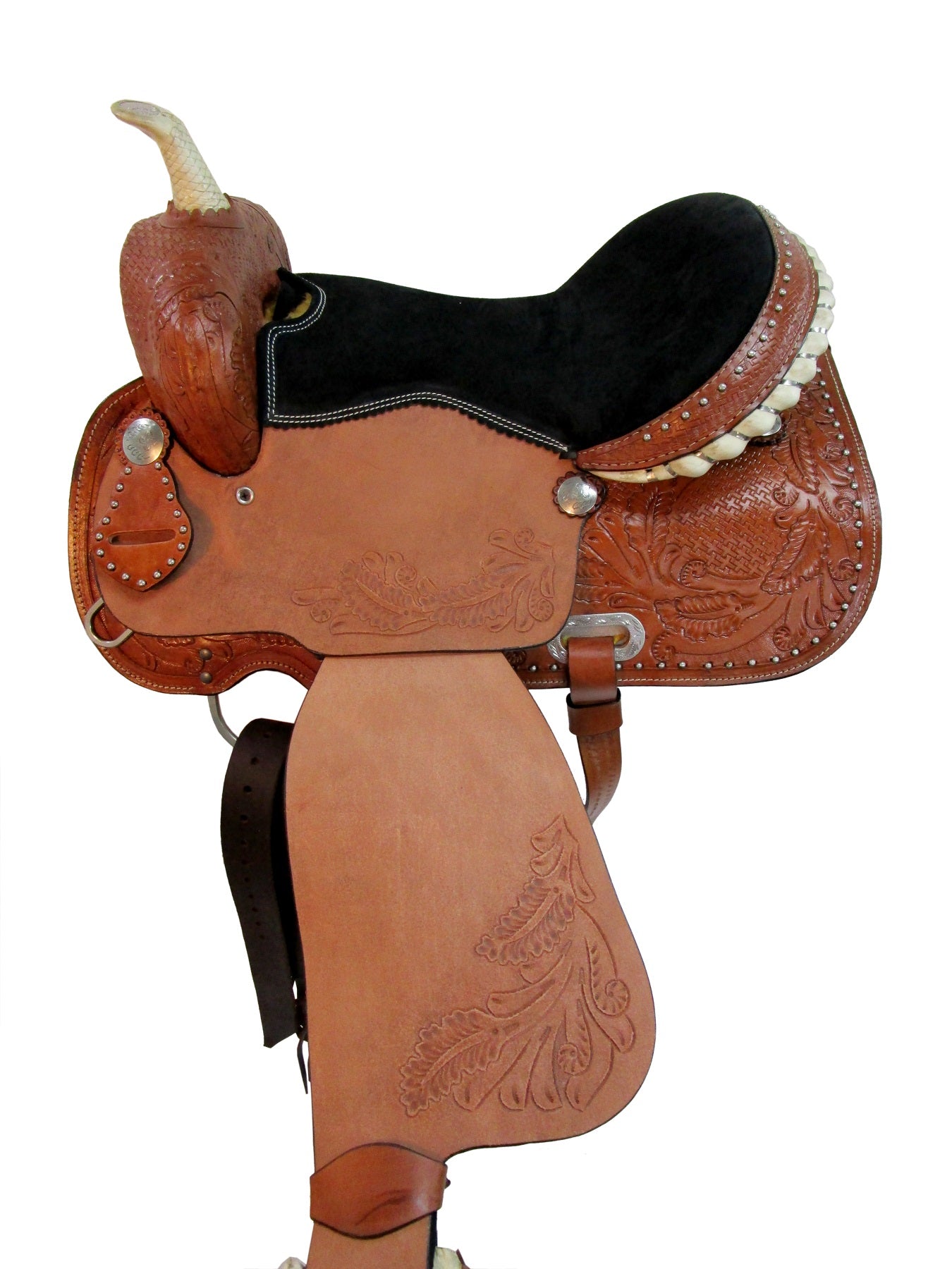 All round Western Saddle for Barrel Racing and Trail Riding, This Western Saddle is made out of Genuine Leather and on Fiber Glass Tree, Free matching Headstall , Breast Collar and Reins, and Package comes with Signature Delivery.